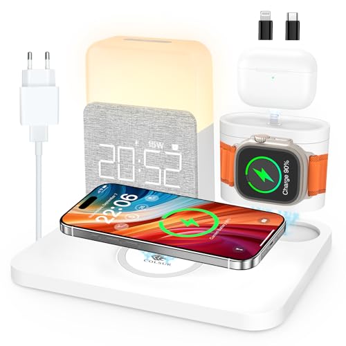 Cargador Inalambrico 5 en 1 iPhone Apple Watch AirPods rapida,Estacion de Carga para Samsung,lampara mesita Noche,Reloj Despertador Digital de luz,Wireless Charger 17/16/15/14/13 Accesorios